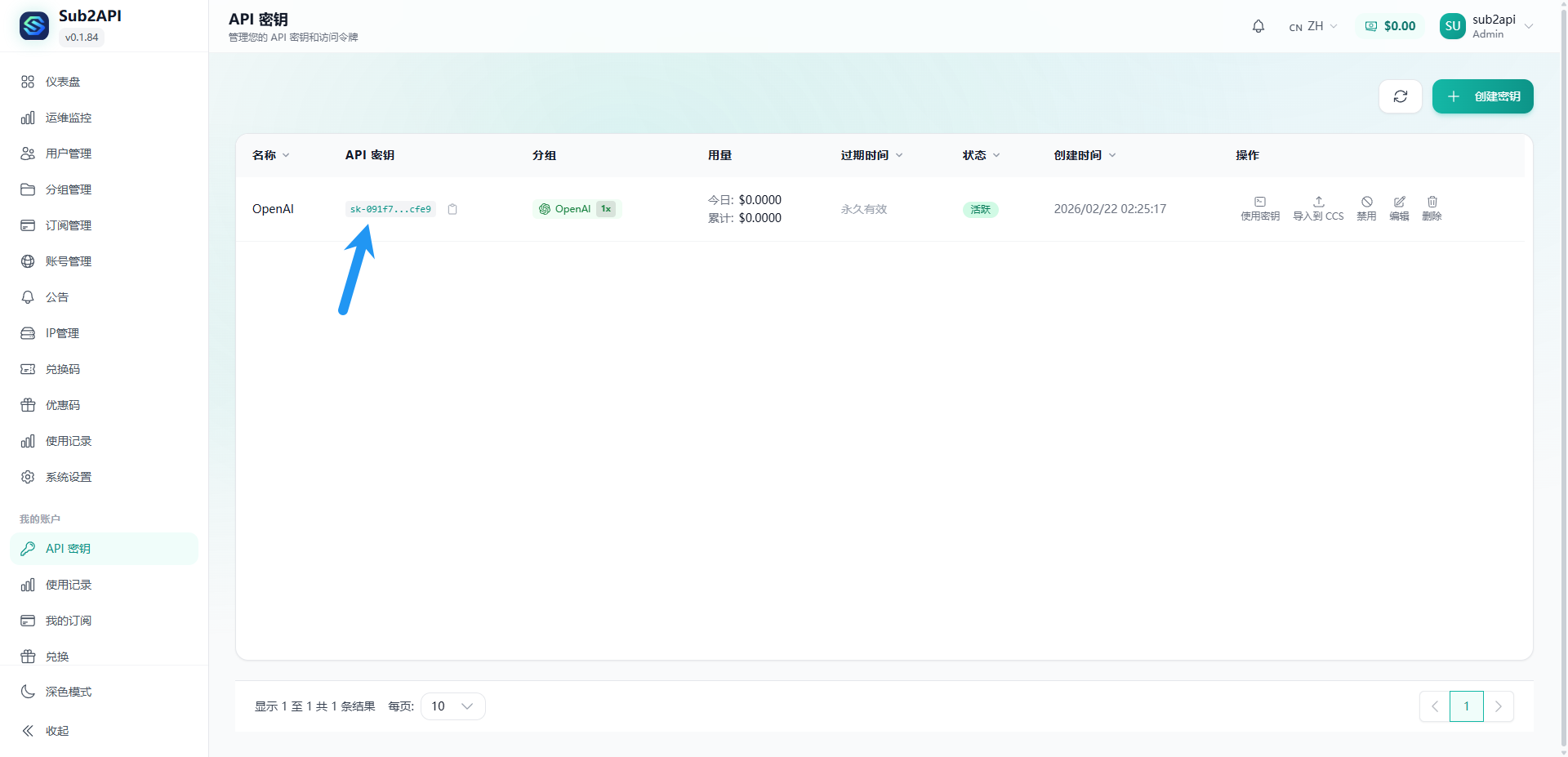 到此已经完成,可以使用该密钥了,BaseURL 即为你的服务器IP:项目端口,点击上图中的使用密钥 可以看到相关配置,这个项目不能提供标准的OpenAI API ,似乎只能给 OpenCode 使用,这里就不过多赘述了